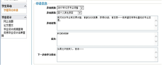 3.“异动说明”:填写申请转专业的理由和转入的学院、专业名称。
