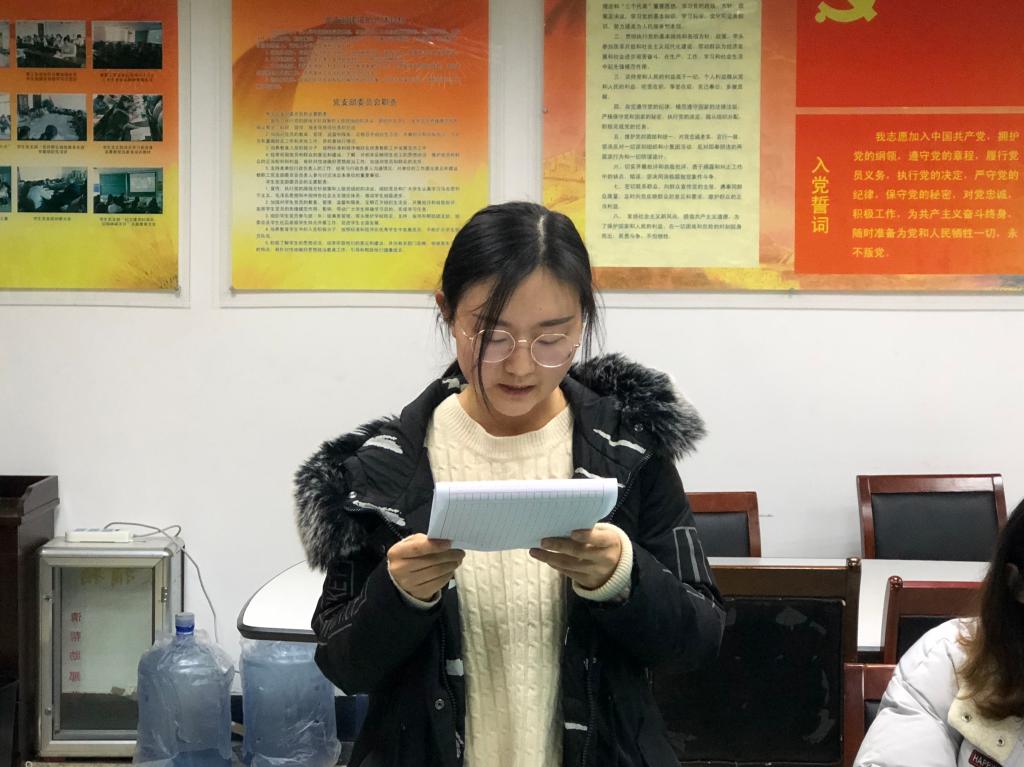 会议伊始,王峰同志向大家介绍了本次会议的议程。王琳琳、魏心怡、庞晨、李晓钒、贾梦媛、王绘涵、汤愫同志作为预备党员宣读了转正申请书,向党支部详细汇报了自己成为预备党员以来的学习、工作方面的表现和思想状况。各位培养人也对预备党员们的表现提出了客观的评价和建议,并对其能否正式按期转正发表意见。正式党员在进行充分讨论后以无记名投票的方式进行表决,经表决,大家一致同意以上7位同志按期按期转为正式党员,党支部书记岳峰同志代表党支部宣读了支部大会决议。随后,新进党员积极表态,表达了自己的决心和目标,表示必将严于律己、提高对自身的要求、积极为同学服务,与会党员对他们表示了祝贺。