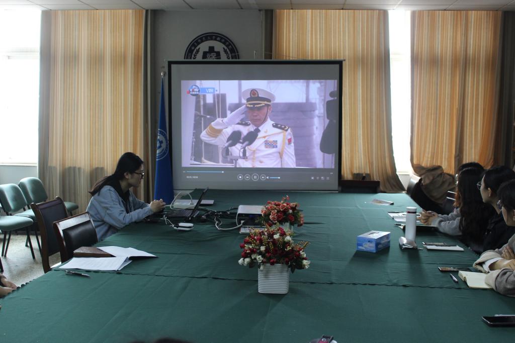 党委副书记董家忠和2016级本科生辅导员王峰带领学院本科生党支部成员进行集中学习,共同观看庆祝中国人民解放军海军建军70周年阅兵活动视频。