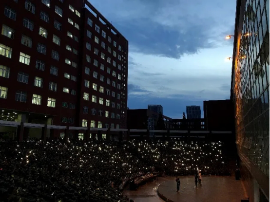 ,一起用欢声笑语化解了第一次离家的伤感和不安。看!图书馆报告厅留存着你欢度中秋的画面;看!西操场上有你的飒爽英姿,一排排的“小绿人”成了一道充满青春与活力的靓丽风景线;看!阳光会场上那次“火爆全网”的全员大合唱,闪闪摇曳的灯光中,“从前从前,有个人爱你很久......”