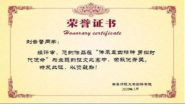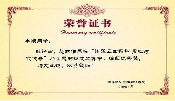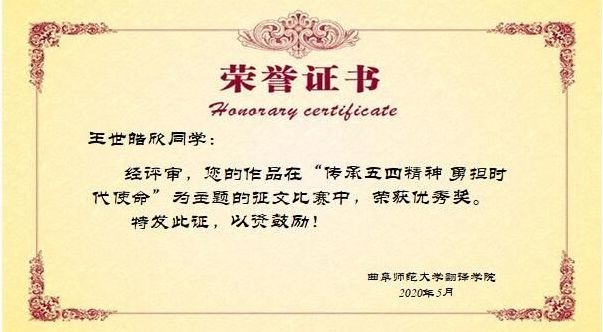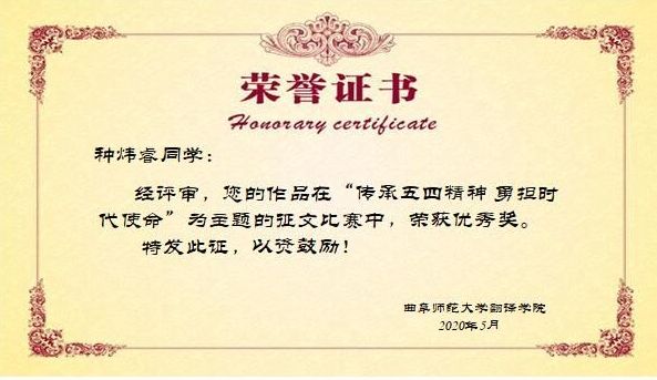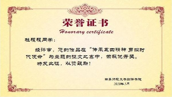 的同学们积极报名参加本次比赛。五四运动已过去了百余年,但五四精神却历久弥新。各参赛者紧扣主题,在征文中诠释了五四精神,并表示新时代中国青年要继续发扬五四精神,肩负起实现中华民族伟大复兴的时代重任,贡献青春力量,争做有为青年,不辜负我们这个伟大的时代。同学们纷纷表示:“参加这样的活动,既能够真切的体会到五四精神,同时还锻炼了自己的文笔,收获颇丰。”征文收集完毕后,经过一系列评选,杜程程、金颖等六位同学获得优秀奖。至此,本次活动圆满结束。