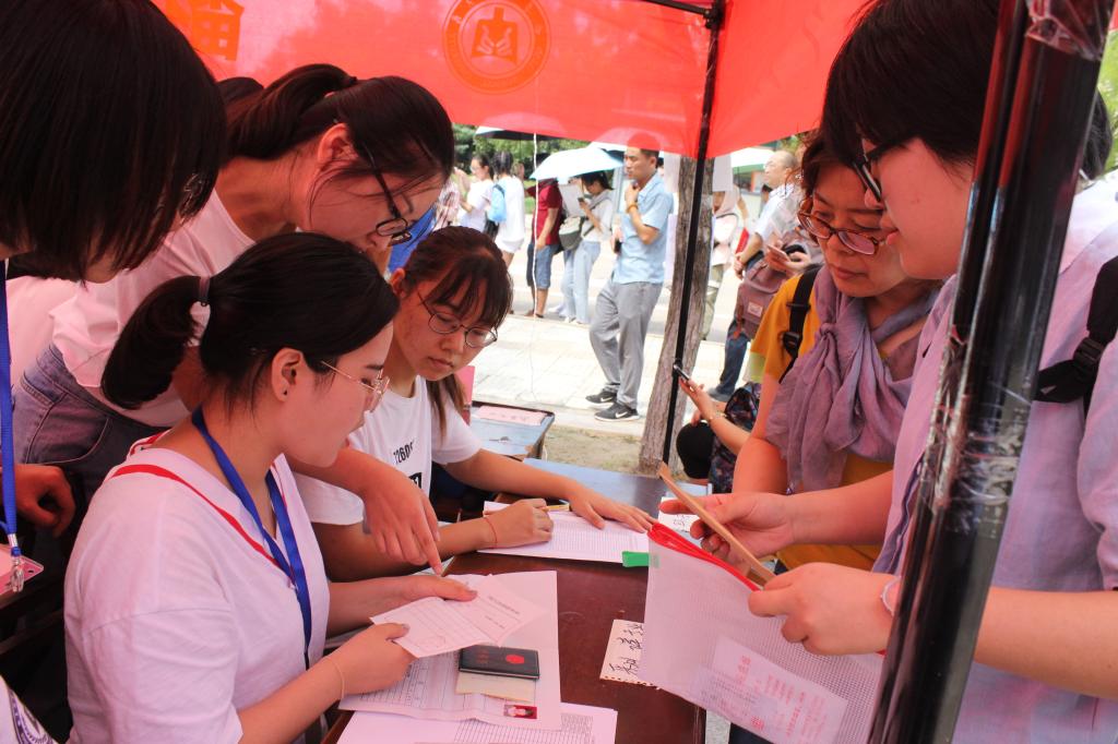 院旗为背景墙的新生拍照区域,便于新同学和家长手持标有英、日、韩三语的标语板合影留念。合影后由引导组带领新生办理住宿手续。各部门成员精诚服务,尽职尽责,报到工作顺利进行。