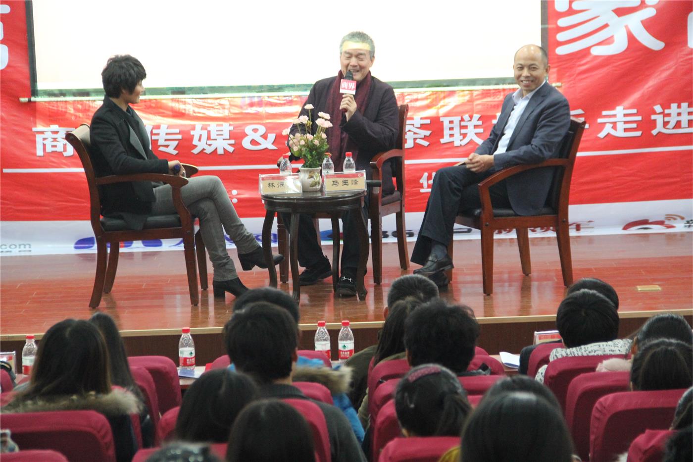 对话活动开始,马玉峰首先介绍了自己的创业经历及在移动互联网时代经营模式的新探索,随后来自台湾的林炳生介绍了自己将豆浆生意由台北进军到大陆的奋斗历程。座谈中,两位企业家针对大学生就业创业等问题进行了详细的解说,提出了当代大学生要想成功,须戒浮戒躁,要有创业的激情,有良好的团队合作意识及要“做一行像一行”且坚持到底的意识。两位嘉宾的精彩座谈赢得了现场热烈的掌声,活动在同学们与企业家积极对话中圆满落幕。