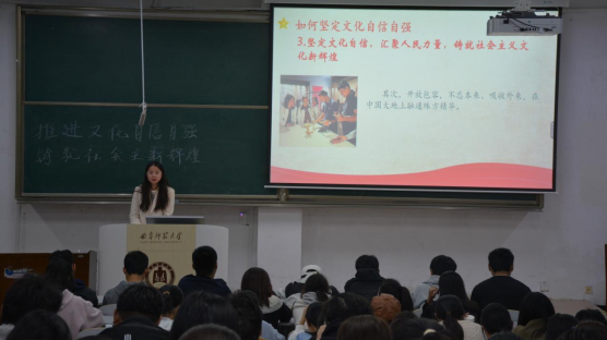 宣讲团紧紧围绕“推进文化自信自强,铸就社会主义新辉煌”、“万山磅礴看主峰,党建引领事业先”,依次列举了全国各地举办的丰富多彩的文化活动,这些活动形式多样、内容丰富,为在座的新生提供了精神盛宴,展示出我国蓬勃发展的文化产业,坚定了全社会的文化自信。宣讲团还通过列举一系列成绩斐然的建设项目,强调要坚定文化自信自强,坚定青年人对党的拥护与爱戴,使同学们深刻认识到党中央对进一步全面深化改革的统一领导的重要性。