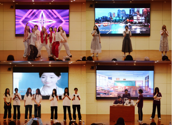 音乐会以“BEMS ON FIRE”为主题,融合歌舞、话剧与配音等多元艺术形式,充分展现商务英语专业特色。开场舞《Boy With Luv》以明快节奏与灵动舞姿迅速点燃现场气氛。双语改编版《Take Me To Your Heart》巧妙融入商务社交场景,在悠扬旋律中彰显跨文化交际的独特魅力。歌曲《See me 4 me》的演唱者以极具感染力的唱腔搭配精准发音,实现了情感表达与专业技巧的完美融合。改编话剧《Snow White》大胆创新,将经典童话重构为商业谈判情境,角色之间以流畅的英文展开激烈博弈,碰撞出全新的戏剧张力。《小猪佩奇》配音节目凭借对原版角色语音语调的高度还原与精准的英语发音,充分展现出翻译学子扎实的语言功底和深厚的专业素养。