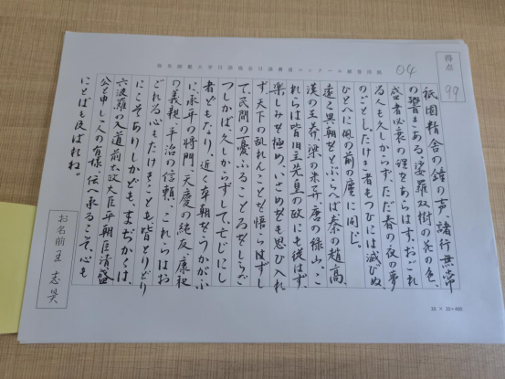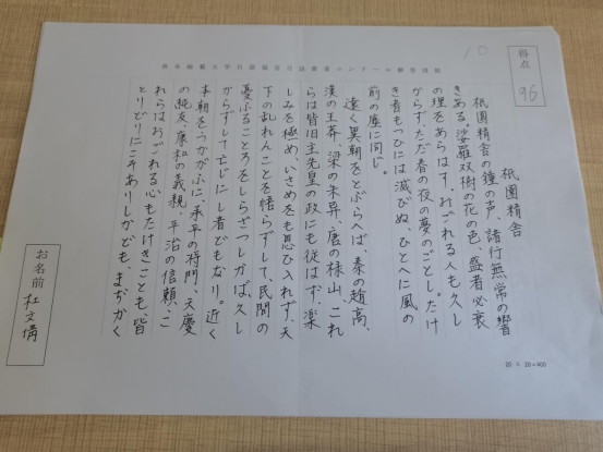 初赛中,同学们积极上交纸质书法作品。书法作品由日语协会评委老师评分遴选并在参赛群内公布决赛入围名单。参加决赛选手统一抄写由指导老师精心挑选的日语美文,使用统一发放的书写纸进行书写。最后,决赛书法作品交由评委老师进行评选。经过评选,获奖情况如下。