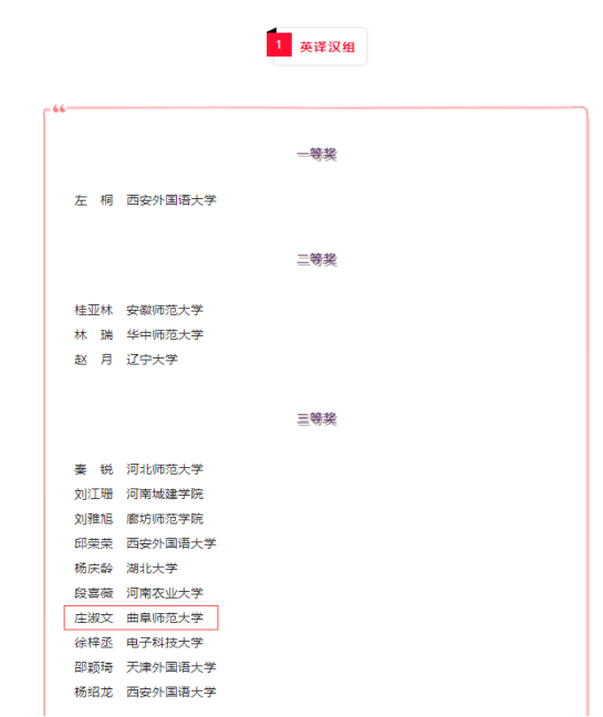 我院MTI专业研究生庄淑文同学荣获英译汉组三等奖,其导师卢卫中教授荣获优秀指导教师称号。另有多名MTI专业研究生同学荣获优秀奖。我院荣获优秀组织奖。