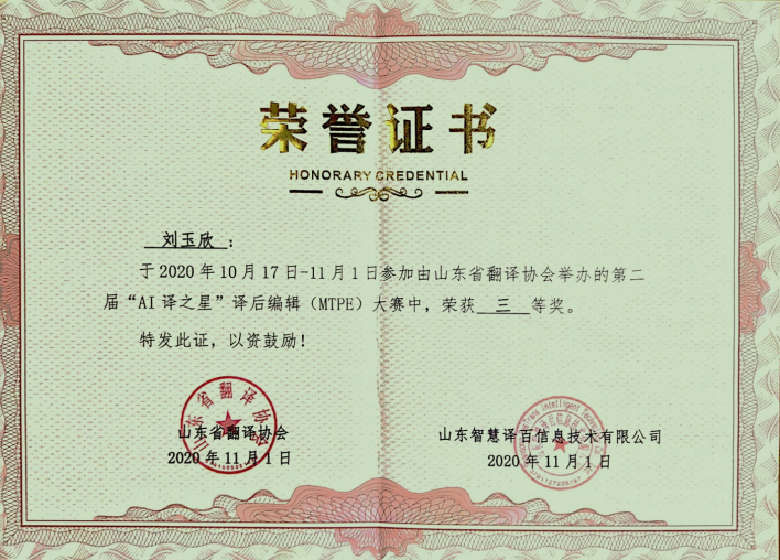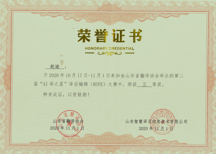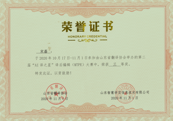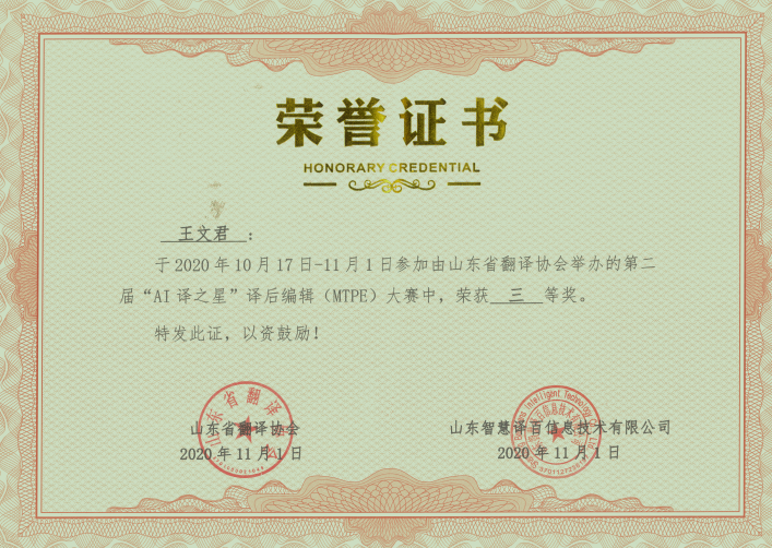 2020年11月1日,山东省第二届“AI译之星”译后编辑(MTPE)大赛比赛结果揭晓,来自91制片厂