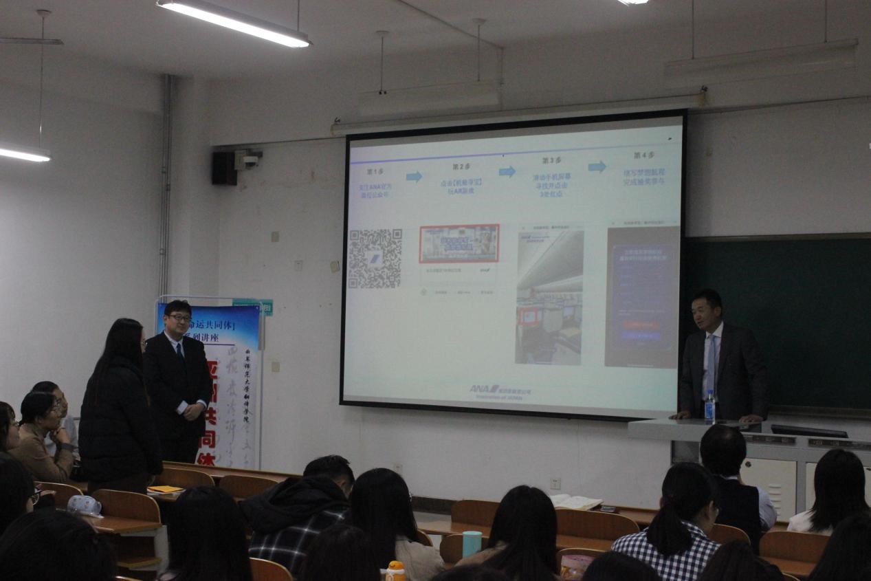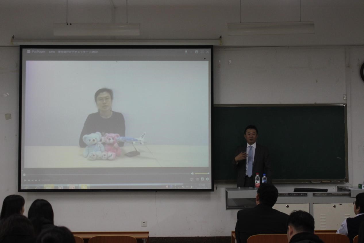 广田至夫社长首先介绍了ANA公司的发展历史,由此引出了ANA中国航线的开通历史。其中,重点讲述了第二代社长冈崎嘉平太先生一生为支持、推动中日友好交流所做的贡献。之后,展示了ANA公司的社会贡献活动,包括捐赠希望学校进行捐赠、组织冈崎嘉平太国际奖学金财团等活动。最后,重点介绍了ANA公司的经营理念、宗旨和行动指南,并展示了ANA青岛分公司职员对我院日语专业学生的学习寄语。
