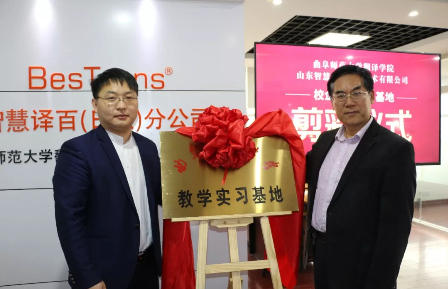 上午10时,卢卫中院长、姜迪秘书长、徐彬教授、江心波总经理为智慧译百日照分公司正式运营剪彩。同时,卢卫中院长、江心波总经理为校企共建实训基地揭牌。