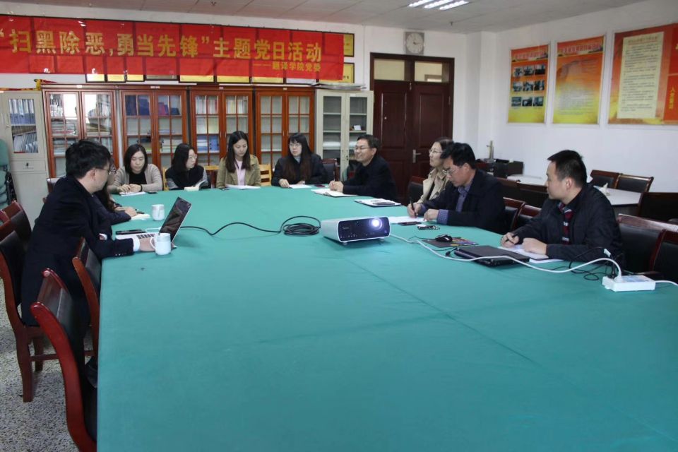 10月30日,山东译传世嘉翻译有限公司总经理江心波先生和翻译事业部(译百)总经理葛玉梅女士来我院考察洽谈翻译实习合作事宜。院长卢卫中,副院长夏云,MTI中心主任许家绍,团委书记岳峰,翻译系主任厉平以及翻译系全体老师出席本次活动。
