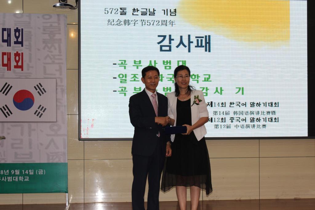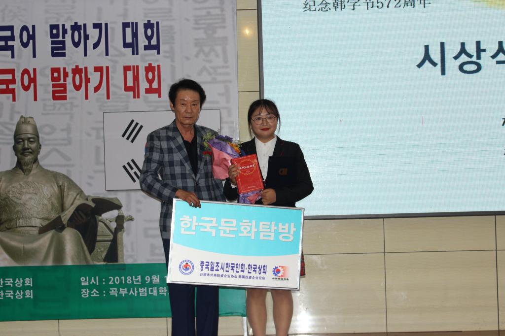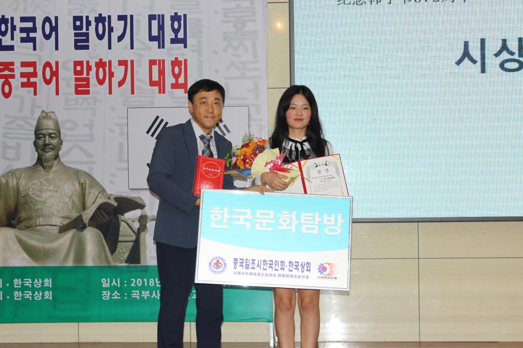共有三名学生参加此次大赛并取得了优异的成绩。陈雪婧同学和路瑶同学都获得了“唐津市议会议长奖”,朱凯娜同学获得了“唐津市市长奖”,这三位同学还同时获得了韩国七日文化体验游的机会。卢正爱、金红英、姜坤三位老师获得大会主办单位和日照市人民政府外事侨务办公室一起颁发的优秀指导老师奖。大会主办单位日照市韩国人商会还为我院李金雷书记、卢卫中院长颁发感谢牌,为91制片厂