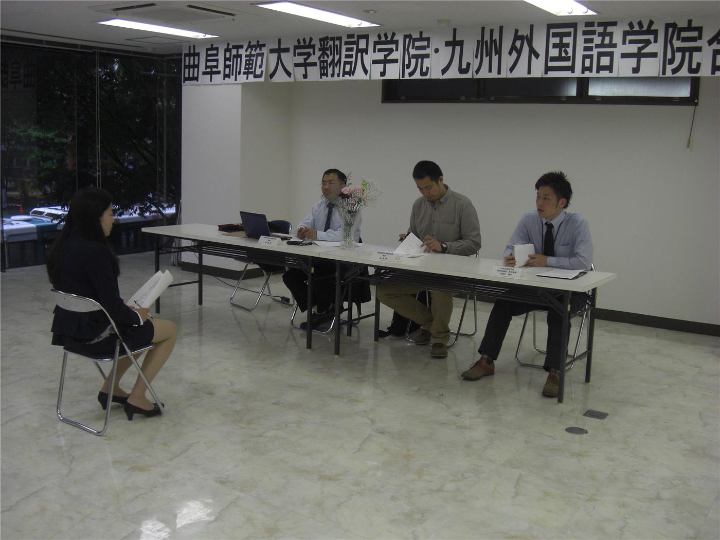 毕业论文答辩结束后,我院两位赴日教师与九州外国语学院副院长、事务局长、专职教师,以及我校目前在九外留学的研究生和本科生进行了座谈,并就我院学生在该学院的生活、学习、考研以及该院的发展状况等问题进行了友好交流。据介绍,在今年4月的日本研究生院入学考试中,我院日语系的3名本科毕业生,均已顺利考入日本一流国立大学。目前我院正在该学院备考的学生也已为自己制定了明确的考学目标和学习计划。为此,九州外国语学院对我校日语本科教育工作寄予了高度评价,并希望今后能够与我院进行更加深入广泛的交流与合作。