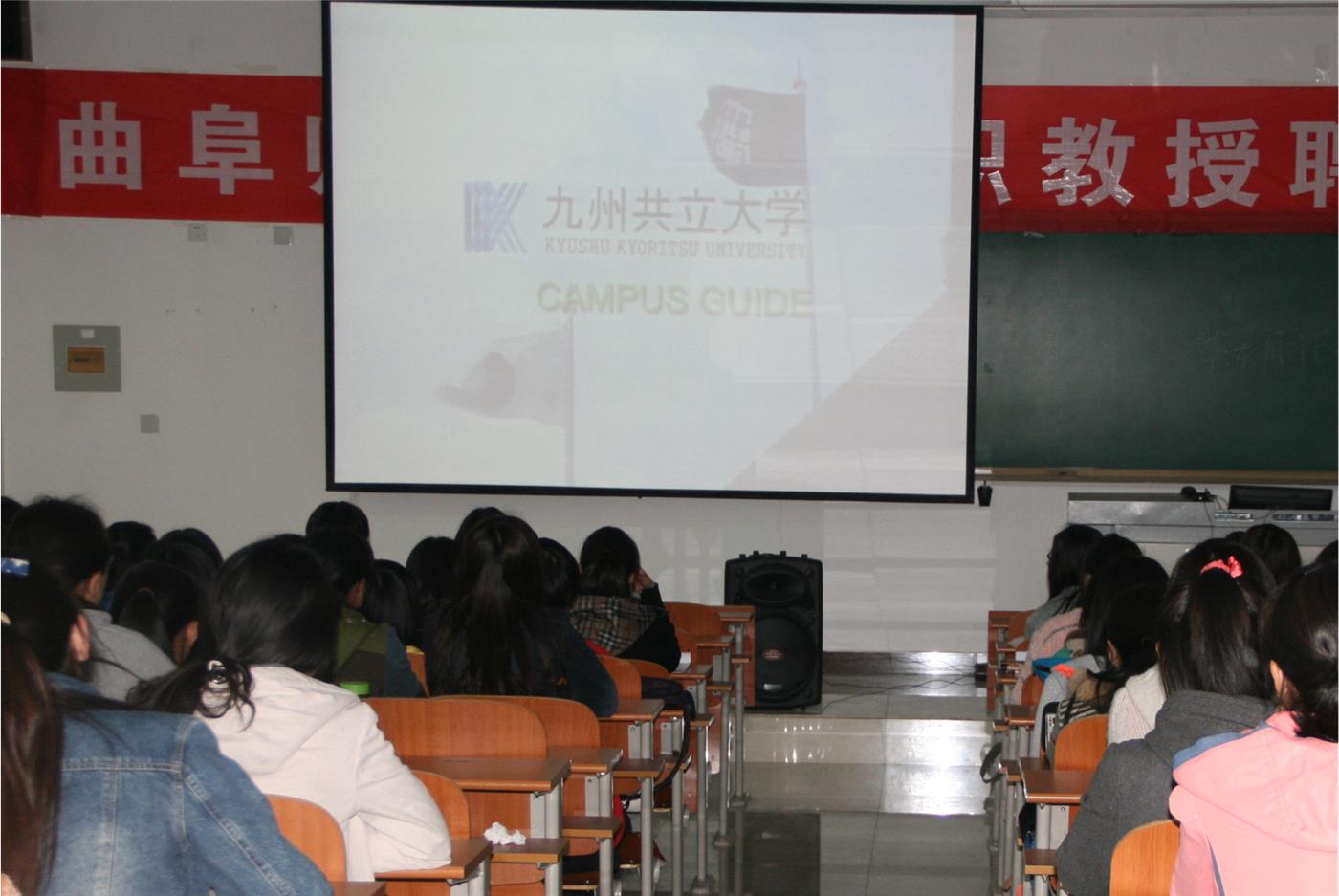 会议伊始,成富勝老师和沙秀程老师就日本九州共立大学的基本情况和资费问题依次上台发表演讲。随后播放的九州共立大学的视频短片,让同学们对九州共立大学的实际情况有了进一步的了解。最后,沙秀程老师和成富勝老师就学生的提问予以解答和延伸。