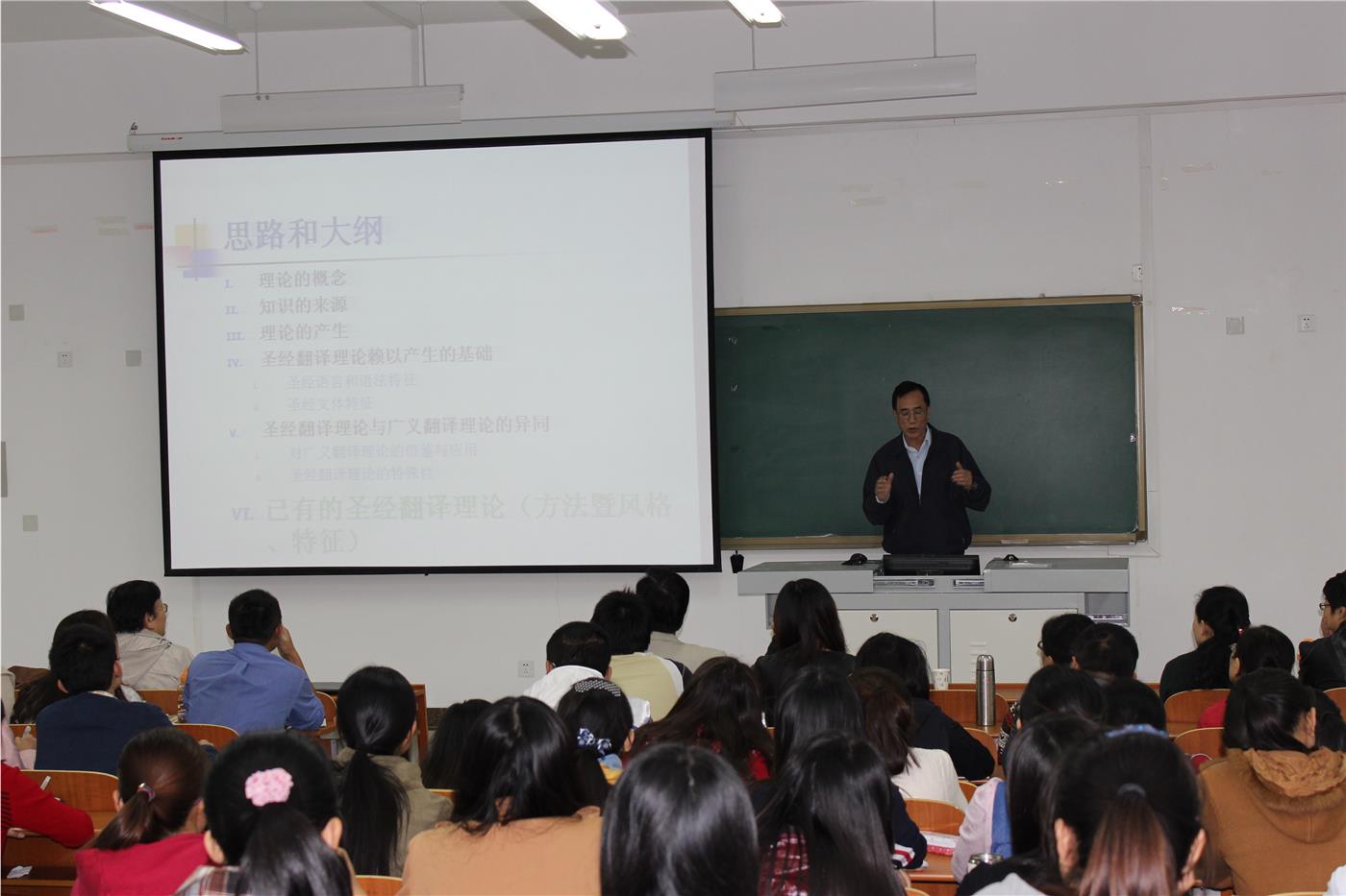 此次报告的主题是“《圣经》翻译理念与实践”。王汉川博士结合自身多年跨文化研究与《圣经》作品翻译的宝贵经验,从美学和跨文化传播学的视角,系统讲解了《圣经》的起源、发展及传播过程,尤其针对《圣经》翻译的特征、风格、理念与方法等方面做了深入剖析与阐述。他强调在全球化时代背景下《圣经》文化传播与翻译对外语、翻译专业的学习与研究有着深刻的必要性及特殊性,并鼓励我院师生在《圣经》翻译实践与理论研究方面做出积极的探索。讲座最后,王汉川博士向91制片厂