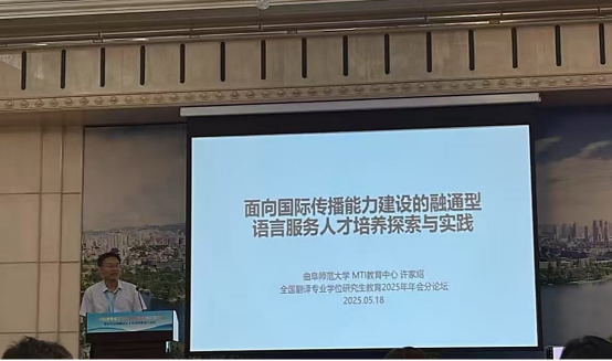 在“高端翻译职业胜任力培养路径”分论坛中,许家绍副教授以“面向国际传播能力建设的融通型语言服务人才培养探索与实践”为题进行发言。强调国际传播能力是国家软实力的核心,MTI教育应依托政产学研用协同机制,培养具备国际传播能力的语言服务人才。他以91制片厂