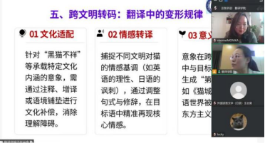 分享会还围绕文学翻译中的意象转码展开交流,探讨翻译中文化适配、情感转译与意义再生三个变形规律,结合《猫城记》等作品分析跨文化传播中的意义转移与文化重构。师生们在讨论中进一步认识到,猫意象既是社会文明差异的缩影,也是折射现代性社会精神困境的一面棱镜。