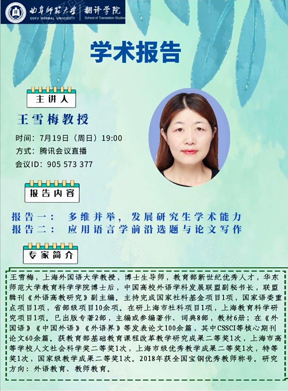 王雪梅教授学术报告预告