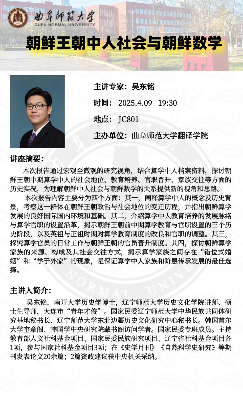 吴东铭博士专家讲座:朝鲜王朝中人社会与朝鲜教学